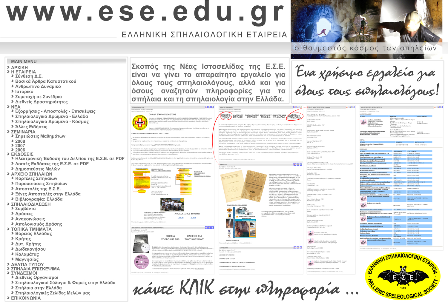 Η νέα ιστοσελίδα της Ελληνικής Σπηλαιολογικής Εταιρείας, ήδη από τους πρώτους μήνες της λειτουργίας της, αγκαλιάστηκε θερμά και καθιερώθηκε στην συνείδηση όλων σαν κορυφαίο σημείο αναφοράς για την σπηλαιολογία στην Ελλάδα.